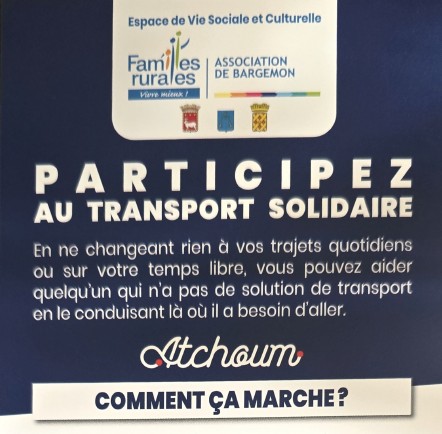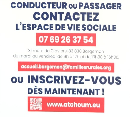 Face aux enjeux de mobilité sur notre territoire, l’Espace de Vie Sociales Familles Rurales de Bargemon, avec la Fédération Départementale du Var et Atchoum, a le plaisir de vous présenter son nouveau service de transport solidaire et de covoiturage.