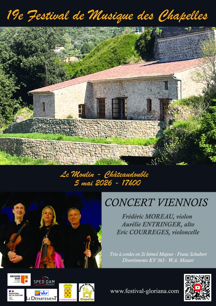 Concert à Châteaudouble le 5 mai 2026 à 17h00 Salle du Moulin Chemin des Avals 19è Festival des chapelles Concert Viennois Trio à cordes – Franz SCHUBERT et W.A MOZART